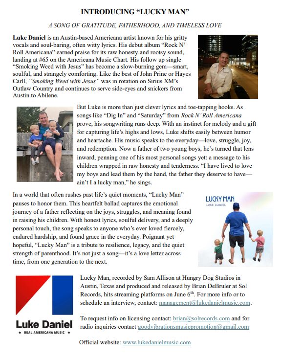 Americana recording artist Luke Daniel has released the heartwarming new single, “Lucky Man.” In a world that often rushes past life’s quiet moments, “Lucky Man” pauses to honor them.